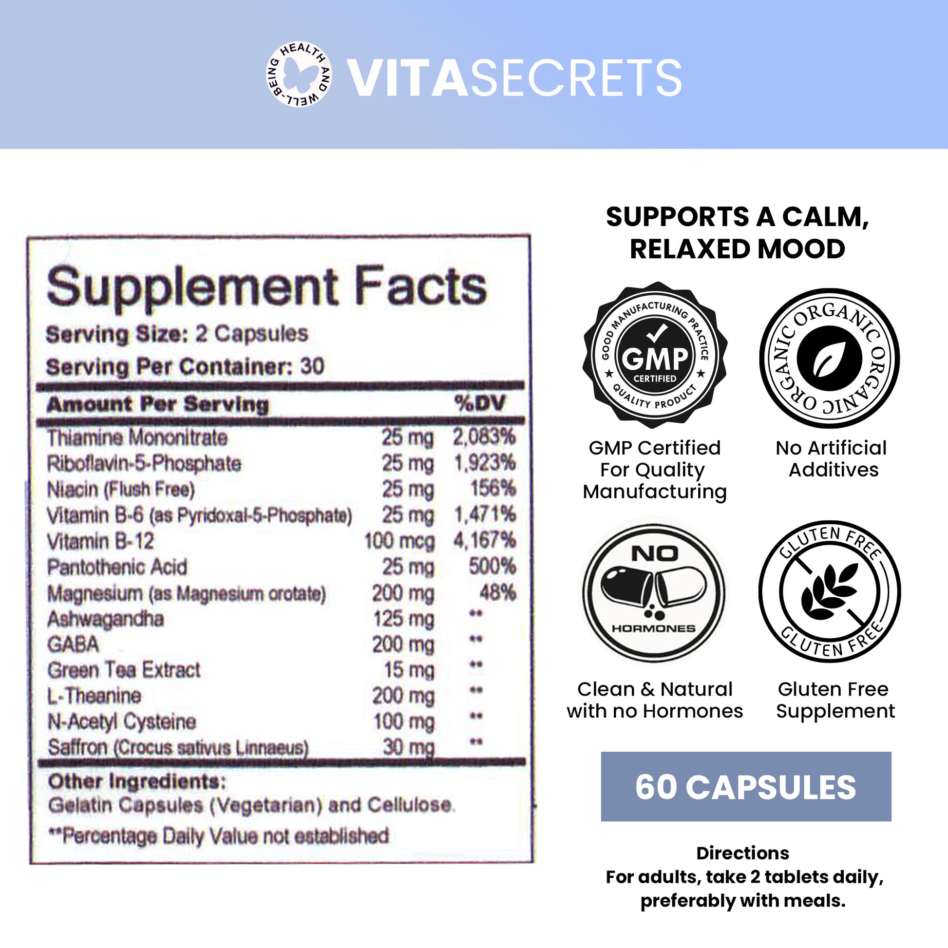 Crafted with a vegan-friendly Vitasecrets formula, backed by years of research, CALM is designed to alleviate overwhelming thoughts and bodily tension. Experience the relaxing effects of GABA, B-Complex Vitamins, and Magnesium, alongside refreshed sleep and a clearer mind. CALM helps silence mental chatter, allowing you to start each day with renewed energy and a positive outlook. The synergistic combination of N-acetyl cysteine, Green Tea, and other key ingredients works to improve mental health and support resilience, addressing stress from multiple angles.